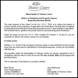 All properties within the Municipality of Thames Centre are hereby requested to be in compliance with the Weed Control Act by the 15th day of April, 2026 and throughout the growing season.